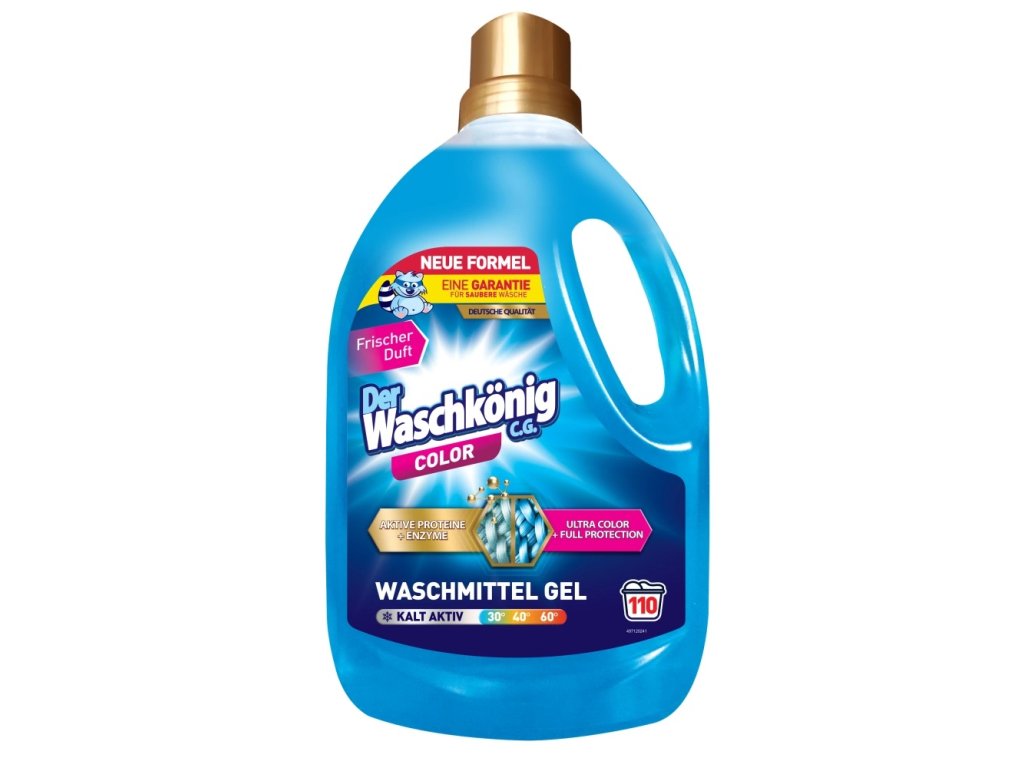Waschkönig Color je prací gel pro barevné prádlo s formulí pro odstranění nečistot a skvrn již od 20 °C při zachování barev. Účinně odstraňuje odolné skvrn z tkanin při nízkých teplotách, chrání je před poškozením a zanechá příjemnou vůni. Gel obsahuje složky, které chrání vaši pračku před usazováním vodního kamene a korozí. Není vhodný pro vlnu a hedvábí.